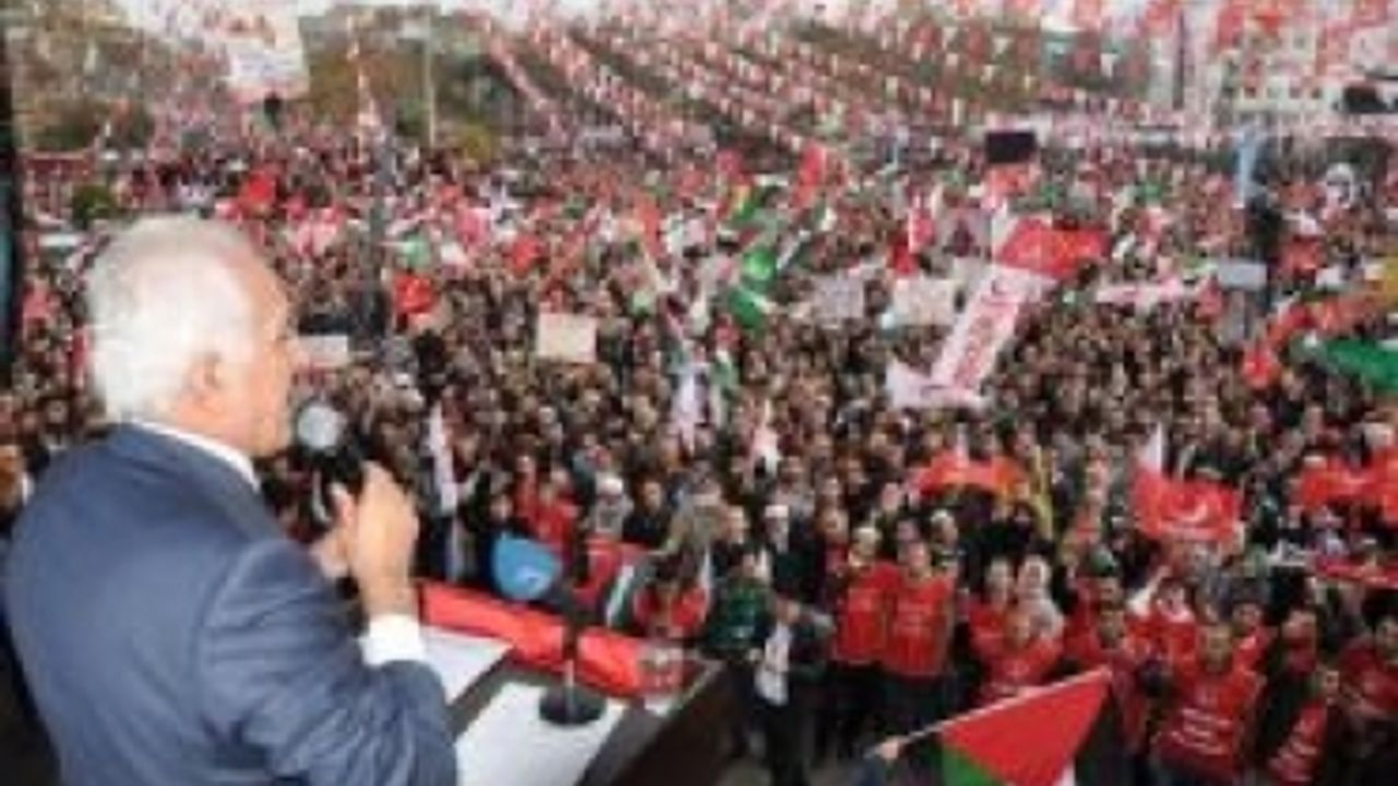 İşte bugün sancağın kalktığı şafağın söktüğü gündür. Kadıköy Meydanı'ndaki bu onurlu duruşunuzdan aldığım cesaretle bir kez daha haykırıyor ve ilan ediyorum; Savaş yerine barışın, zulmün yerine adaletin, sömürü yerine hakça paylaşımın hâkim olduğu yeni bir dünya er ya da geç kurulacaktır. İşte Gazze... Dünyanın en donanımlı uçaklarına, tanklarına ve füzelerine sahip İsrail, eli sapanlı, yüreği imanlı, Gazzeli çocukların karşısında mutlak bir yenilgi almıştır. Çünkü onların bilmediği ama bizim çok iyi bildiğimiz bir gerçek vardır. Bir ülkenin en büyük gücü tankı, topu, tüfeği değil, imanlı ve inançlı evlatladır" diye konuştu.