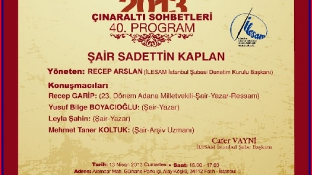 “Şair Sadettin KAPLAN” başlıklı 40. Çınaraltı Sohbet’inin, Alemdar Mah. Gülhane Parkı içi, Alay Köşkü, 34112 Fatih- İstanbul (Ahmet Hamdi Tanpınar Edebiyat Müze ve Kütüphanesi) adresinde 13 Nisan 2013,Cumartesi günü Saat 15.00’de başlayacağı ve programa katılımın serbest olduğu bildirildi.