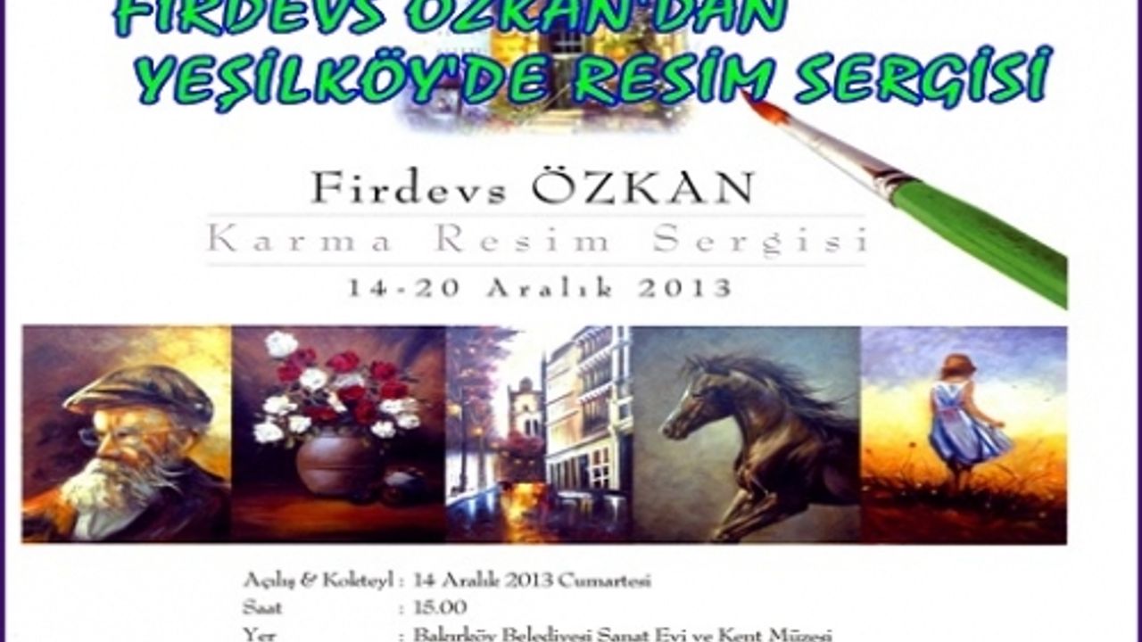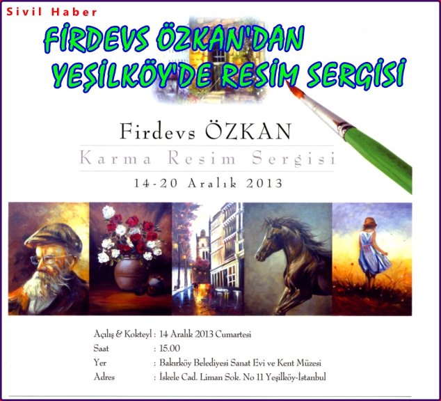 Ressam Firdevs Özkan’ın yağlı boya resimlerinden oluşan resim sergisi Yeşilköy Sahil’de Balıkçılar Barınağı karşısında bulunan Bakırköy Belediyesi Sanat Evi ve Kent Müzesi’nde 14 Aralık 2013-Cumartesi günü saat 15.00’de yapılacak açılış kokteyli ile sanatseverlerin beğenisine sunulacak.