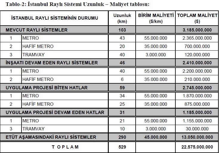 Dolayısıyla, şehirlerimizi büyük ve yoğun yapıp, ev-iş-okul arasındaki günlük dolaşımları ne kadar arttırırsak ulaşım çözümü olarak daha pahalı bir sistemi seçmek durumunda kalmaktayız. Bu aşamada ülkemizin en kalabalık ili olan İstanbul’daki mevcut, devam eden ve planlanan raylı sistem yatırımlarının büyüklük ve maliyetlerine ile toplu taşımada raylı sistemi de kullanan diğer illerimizdeki değerlere bir bakalım. Hatların maliyeleri yaklaşık olarak öngörülen sistem birim maliyet fiyatları ile hat uzunluklarının çarpımıyla bulunmuştur.