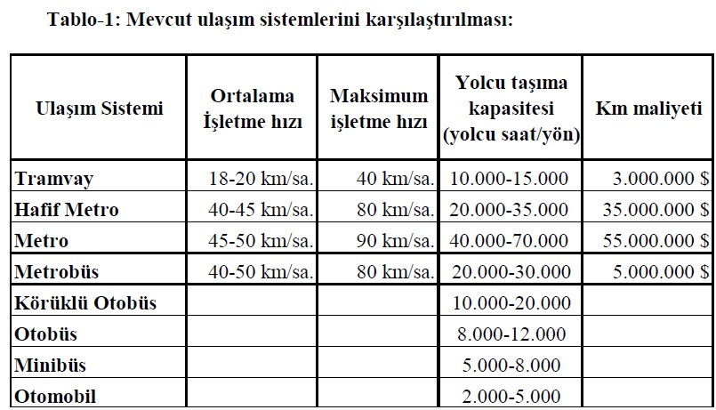Öncelikli olarak mevcut olarak kullandığımız ve planlamasını yapacağımız şehirlerde kullanacağımız muhte-mel toplu taşıma sistemlerinin karşılaştırmalı bir değerlendirmesini yapalım.