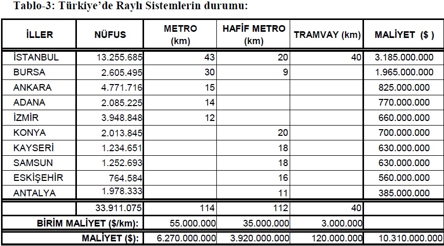 Görüldüğü gibi ülkemizde toplu taşımada raylı sistemi kullanan illerimiz, nüfusu belli bir büyüklüğün üzerindeki iller olmaktadır. Nüfusu 1.000.000’un üzerinde olan iller genellikler bu masrafa girişmiş olup Eskişehir bunu bir istisnası olarak göze çarpmaktadır. Nüfusu 1.000.000’un üzerinde olan diğer iller de başta Gaziantep olmak üzere raylı sistem yatırımları için sıraya girmişlerdir. Dolayısıyla, şehirlerimizi çok büyütmez megapoller haline getirmez, raylı sistem ihtiyacını doğuran ulaşım talebi yoğunluğunu planlama aşamasında çözebilirsek ulaşım yatırımlarında tasarruf etmiş oluruz. Belli bir büyüklükte olan yerleşim yerlerinde de metrodan daha az maliyetli hafif metro veya tramvay ile daha ekonomik çözümlere gidilmiş olunur.