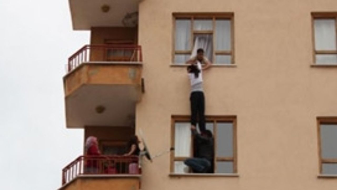Annesinin ve alt kattaki komşusunun da tutup düşmesini engelemeye çalıştıkları M.Ç., diğer komşularının da yardımıyla kollarından tutulup içeri çekilerek kurtarıldı.