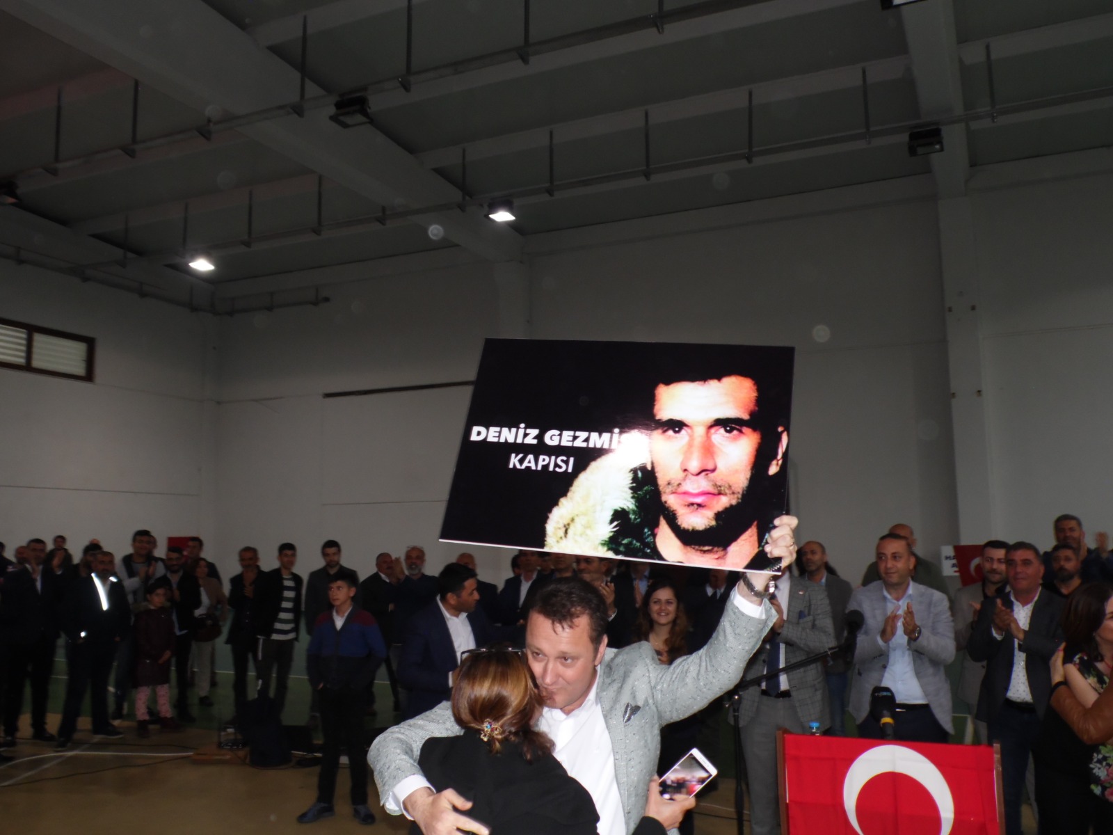 Başkan Aksoy şiiri okurken üzerinde"Deniz Gezmiş kapısi" yazılı fotoğrafı kaldırarak " gördüğünüz gibi diğer kapimizin adı da 'Deniz Gezmiş kapısi' olacaktır" dediğinde salon; "Deniz Gezmiş " sloganları , ıslıklar ve alkışlarla bir kez daha inledi. Ve kitle başkan Aksoy'un boynuna sarılarak uzunca bir süre adeta sevgi seline boğdu.